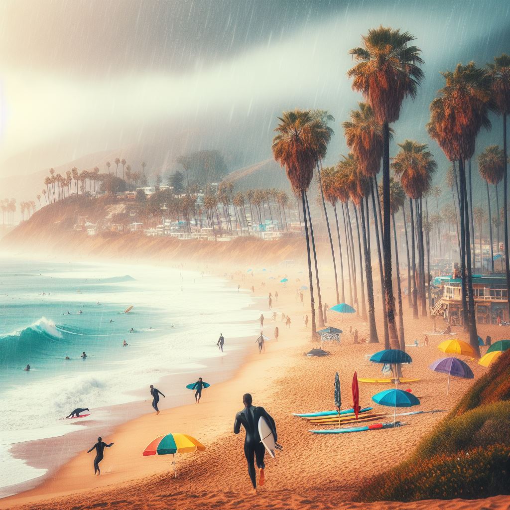 A lone surfer runs along the beach in a tropical location, holding their surfboard as rain falls and mist rolls in over the ocean.