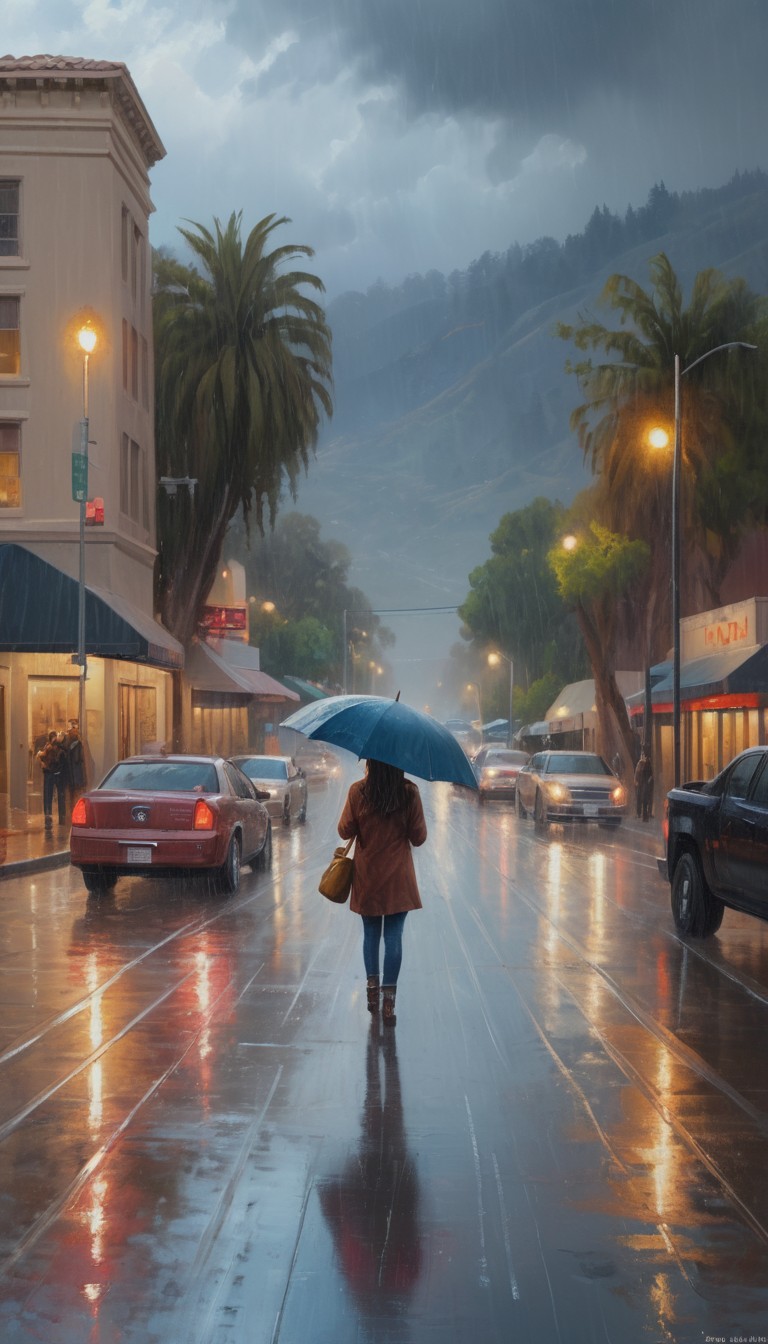 A woman walks down a city street under an umbrella, rain falling on the wet pavement.