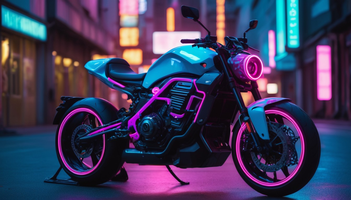blue, chrome, city, dark, design, futuristic, lights, modern, motorcycle, neon, night, pink, sign, street, streetlight, transportation, urban, vehicle, vibrant, wheels
