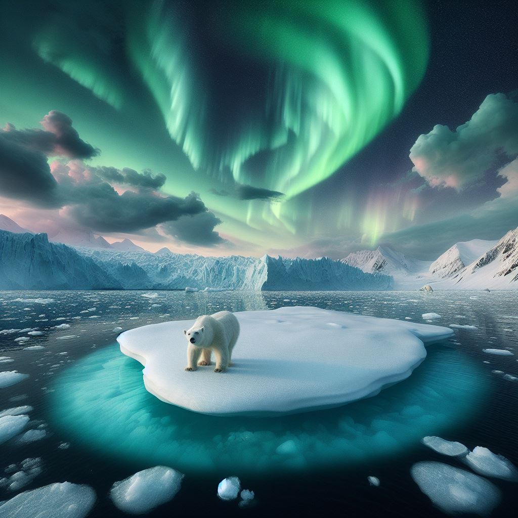 A lone polar bear stands on a small ice floe surrounded by water, with the green aurora borealis dancing in the night sky above.