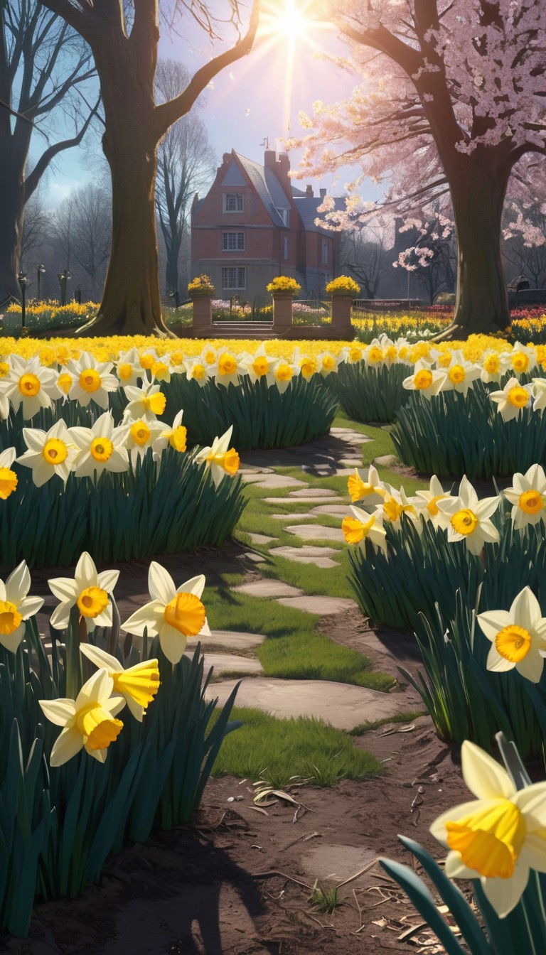 blooming, blossom, daffodils, day, flowers, foliage, garden, green, house, landscape, nature, outdoors, path, spring, stone, sunny, sunshine, trees, white, yellow