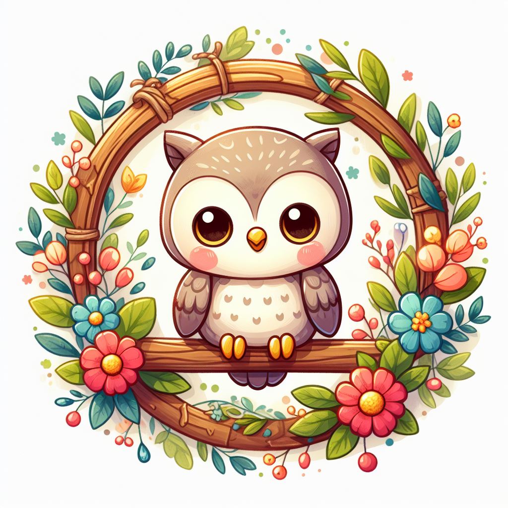 A cartoon owl with big eyes sits on a branch surrounded by a colorful floral wreath.