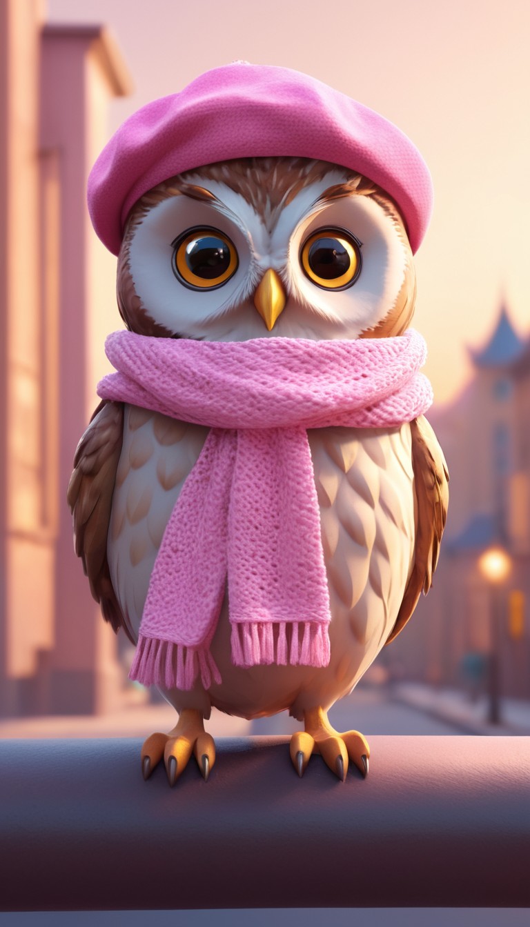 accessory, adorable, animal, beret, big, bird, cartoon, city, cute, eyes, fashion, fluffy, owl, perched, pink, railing, scarf, street, style, winter