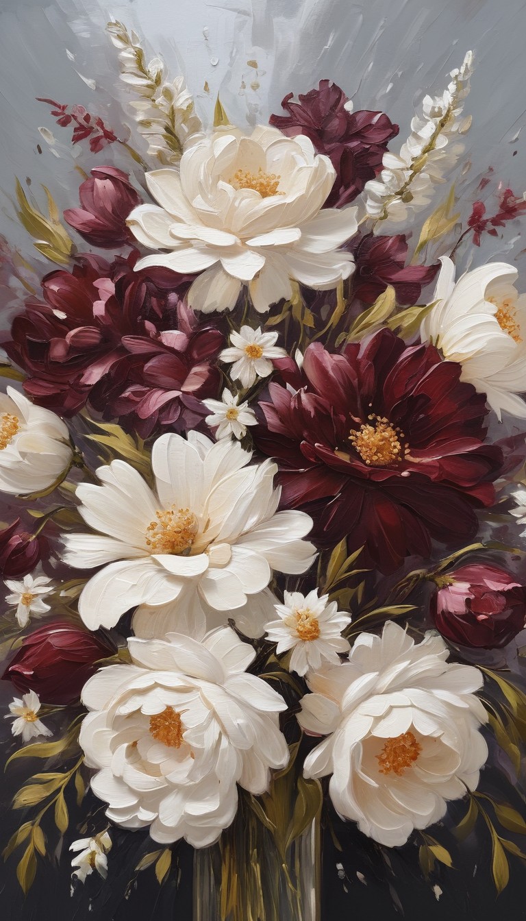 A close-up of a vibrant floral arrangement featuring white and burgundy blooms, painted in a realistic style.