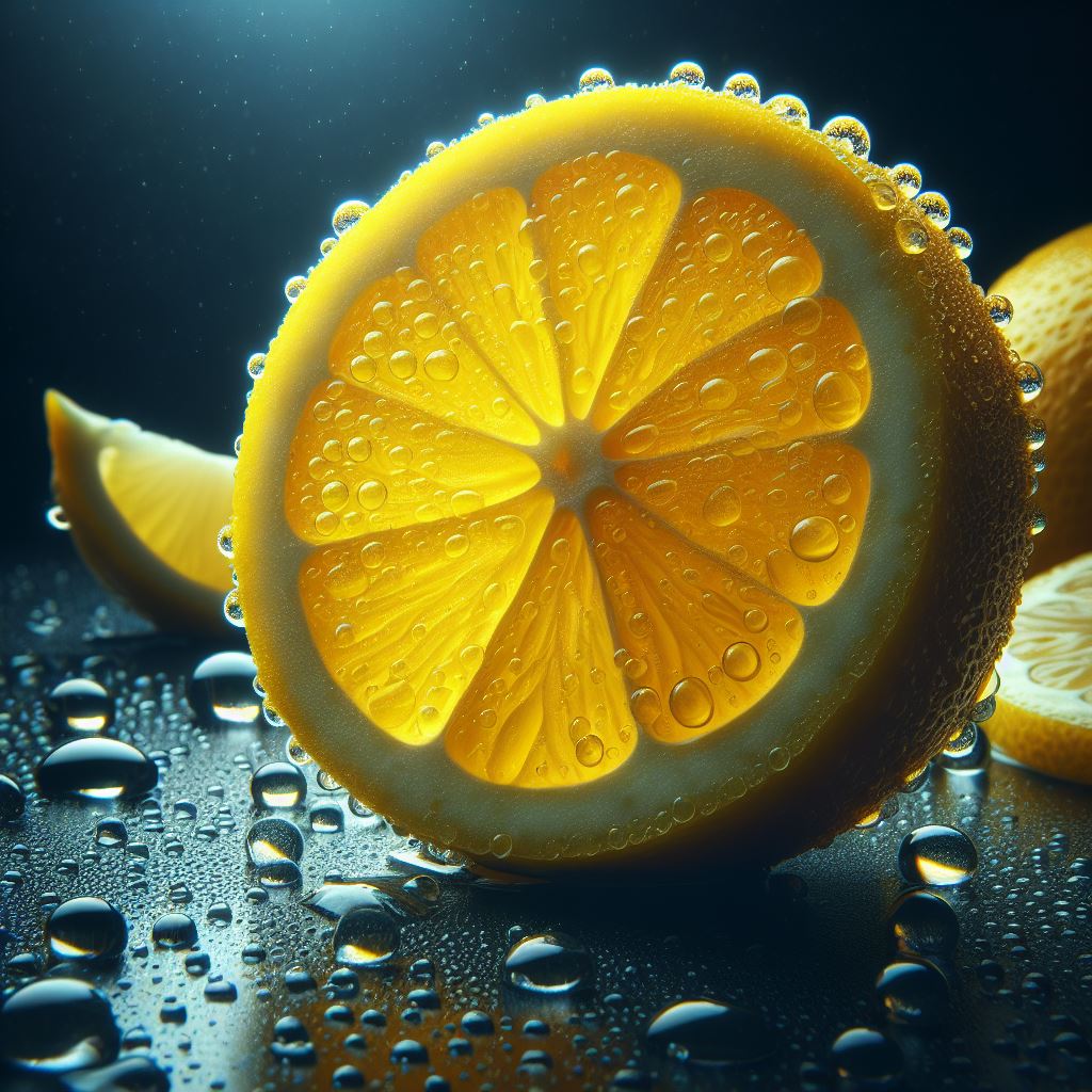 A close-up of a lemon slice with water droplets on its surface, illuminated by a bright light source.