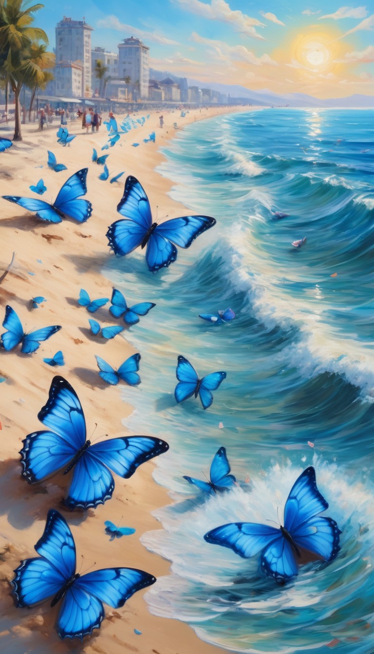 Blue butterflies flutter over a sandy beach with waves crashing in the background. The setting sun casts a warm glow on the cityscape in the distance.