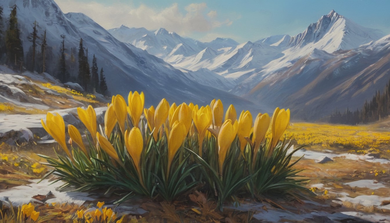 alpine, bloom, botany, crocuses, field, flowers, foothills, green, hills, landscape, mountain, nature, range, scenic, snow, spring, sunny, valley, wild, yellow