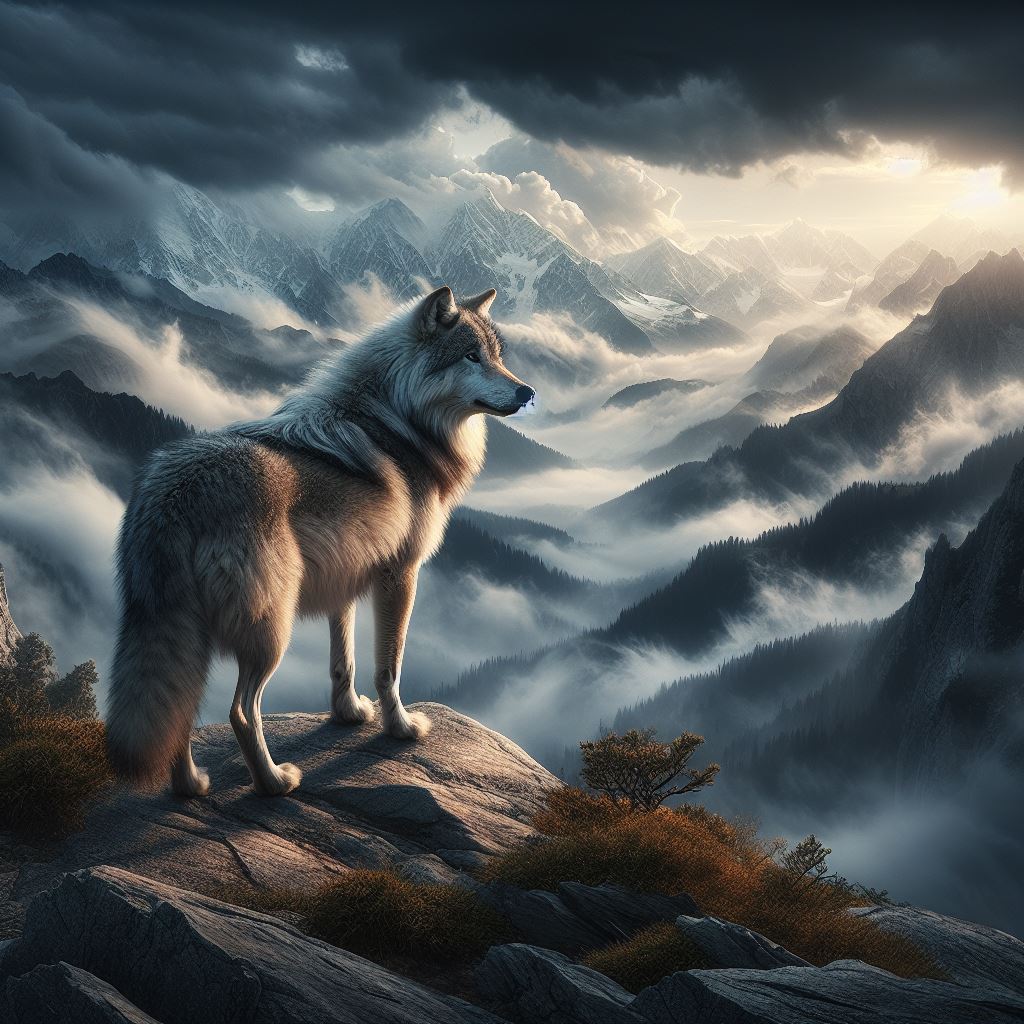 A lone wolf stands high on a rocky peak, gazing at a misty valley surrounded by mountains as the sun breaks through the clouds