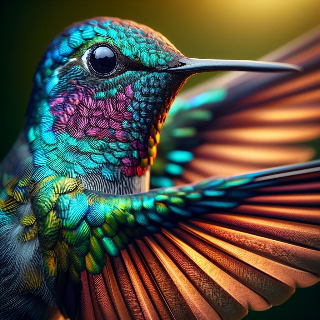 Close-up of a hummingbird with shining green, blue, and purple feathers. Wings outspread, showcasing intricate patterns