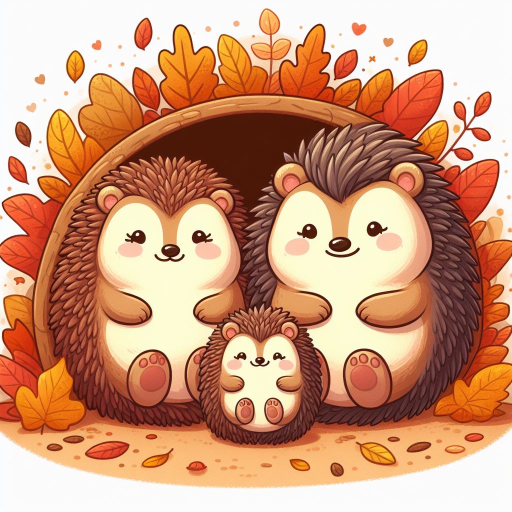adorable, animal, animals, autumn, brown, cartoon, cozy, cute, fall, family, forest, hedgehog, illustration, leaves, nature, season, spiky, togetherness, wildlife, woodland