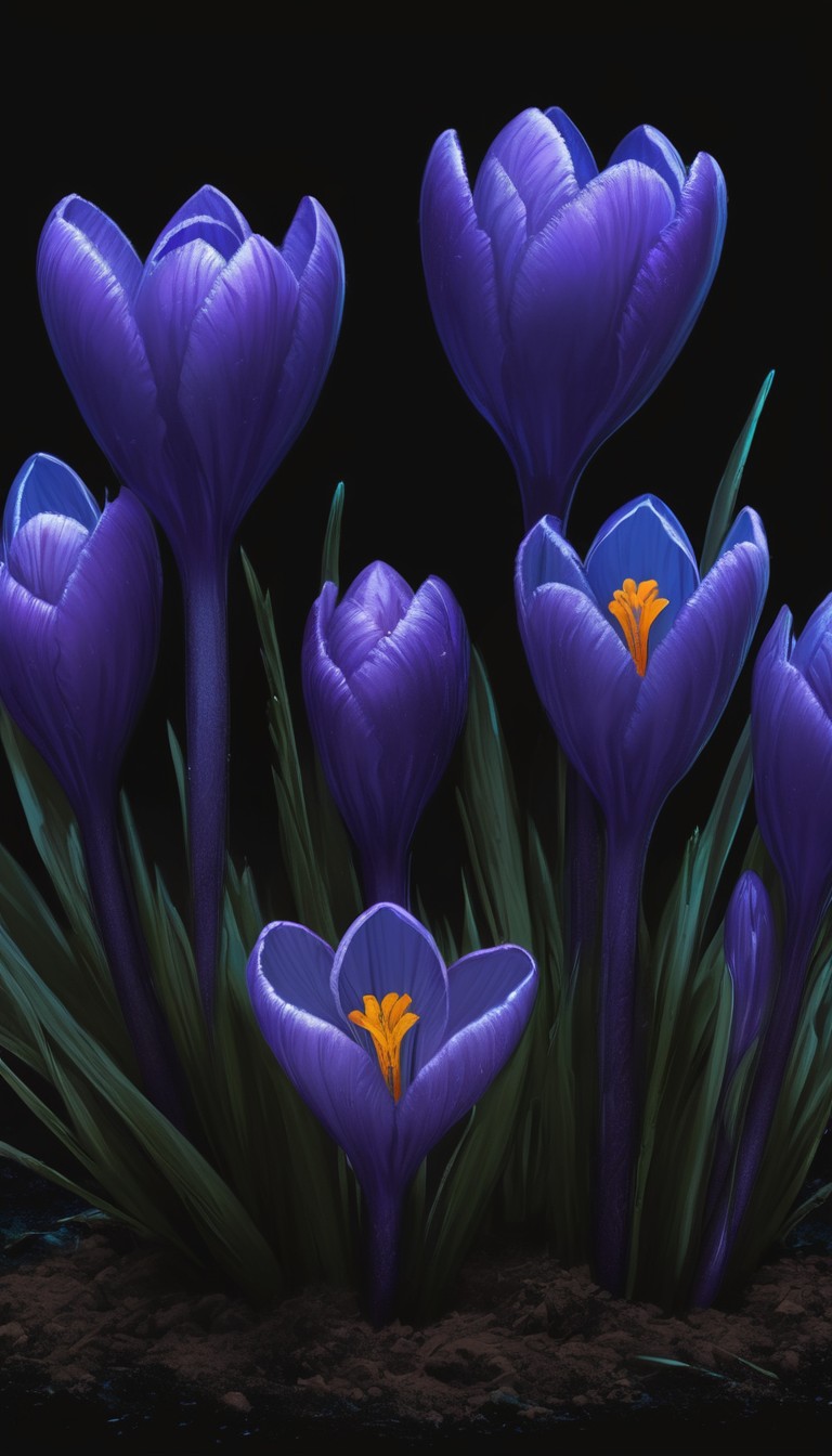 A group of vibrant purple crocuses bloom in a dark garden, their delicate petals contrasting against the black background.