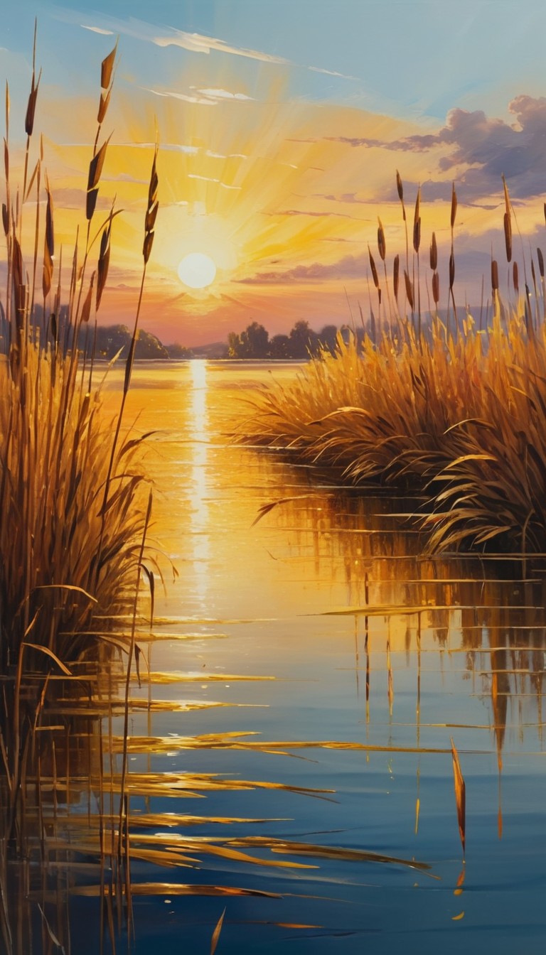A serene lake with reeds along the banks is bathed in the golden light of the setting sun.