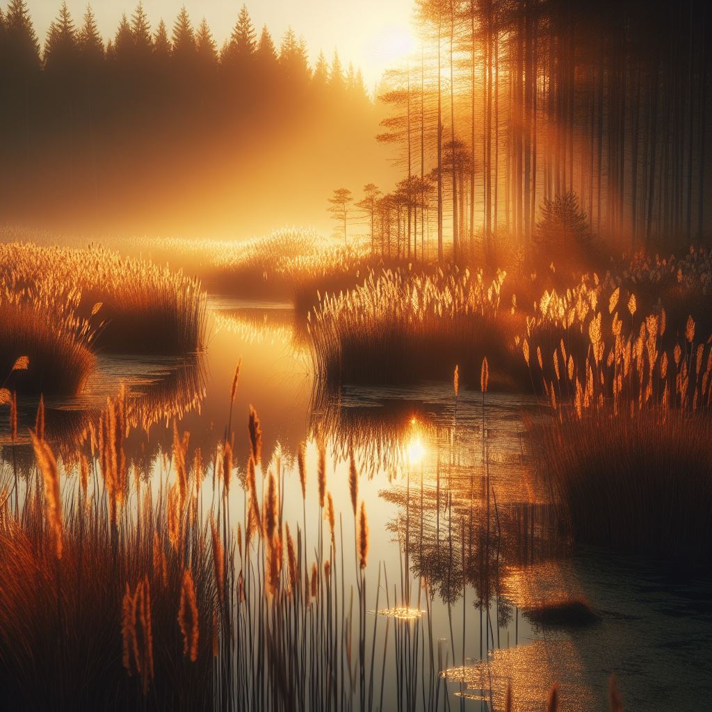Golden sun reflects on misty lake at dawn, tall grasses line the banks, creating a warm scene