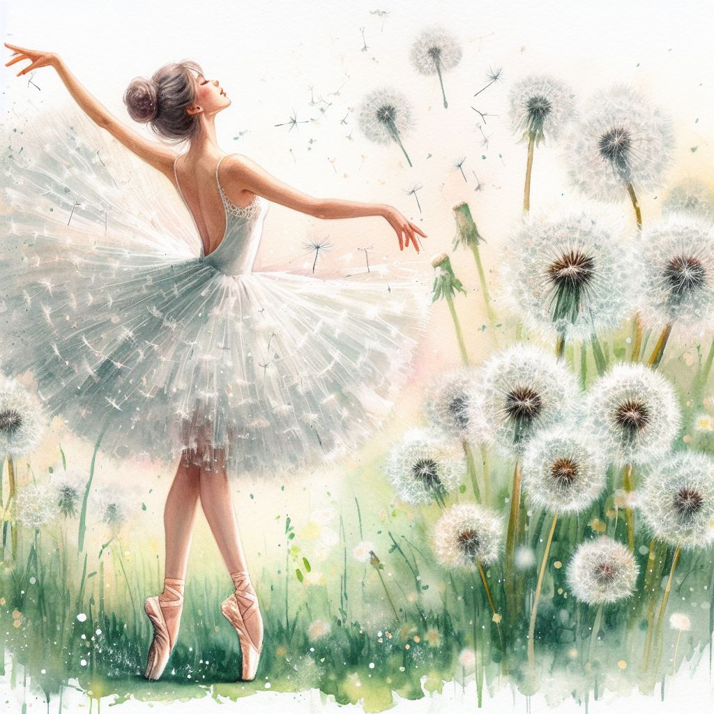 A ballerina in a white tutu dances gracefully amidst a field of dandelions, their delicate seeds scattering in the breeze.