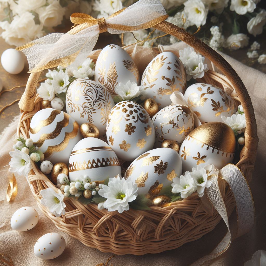 A wicker basket overflowing with white and gold decorated Easter eggs, surrounded by delicate white flowers.