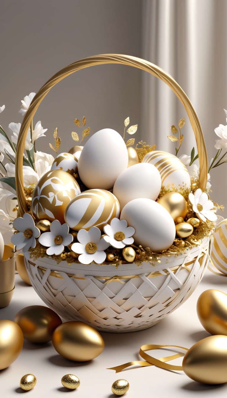 A white wicker basket filled with white and gold Easter eggs, surrounded by small white flowers and golden leaves.