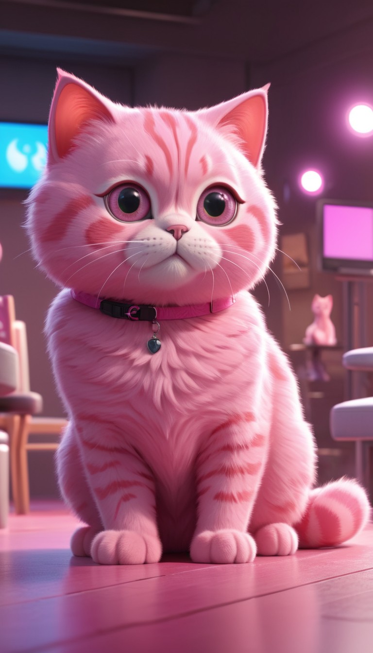 A pink cat with large eyes sits on a pink floor, looking up and to the left.