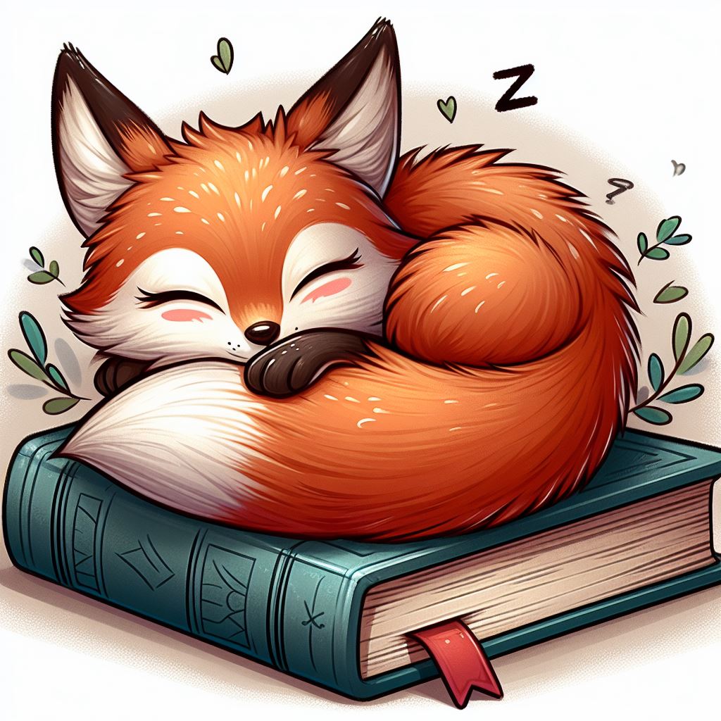 A cartoon fox with orange fur is sleeping curled up on a large, blue book with a red bookmark.