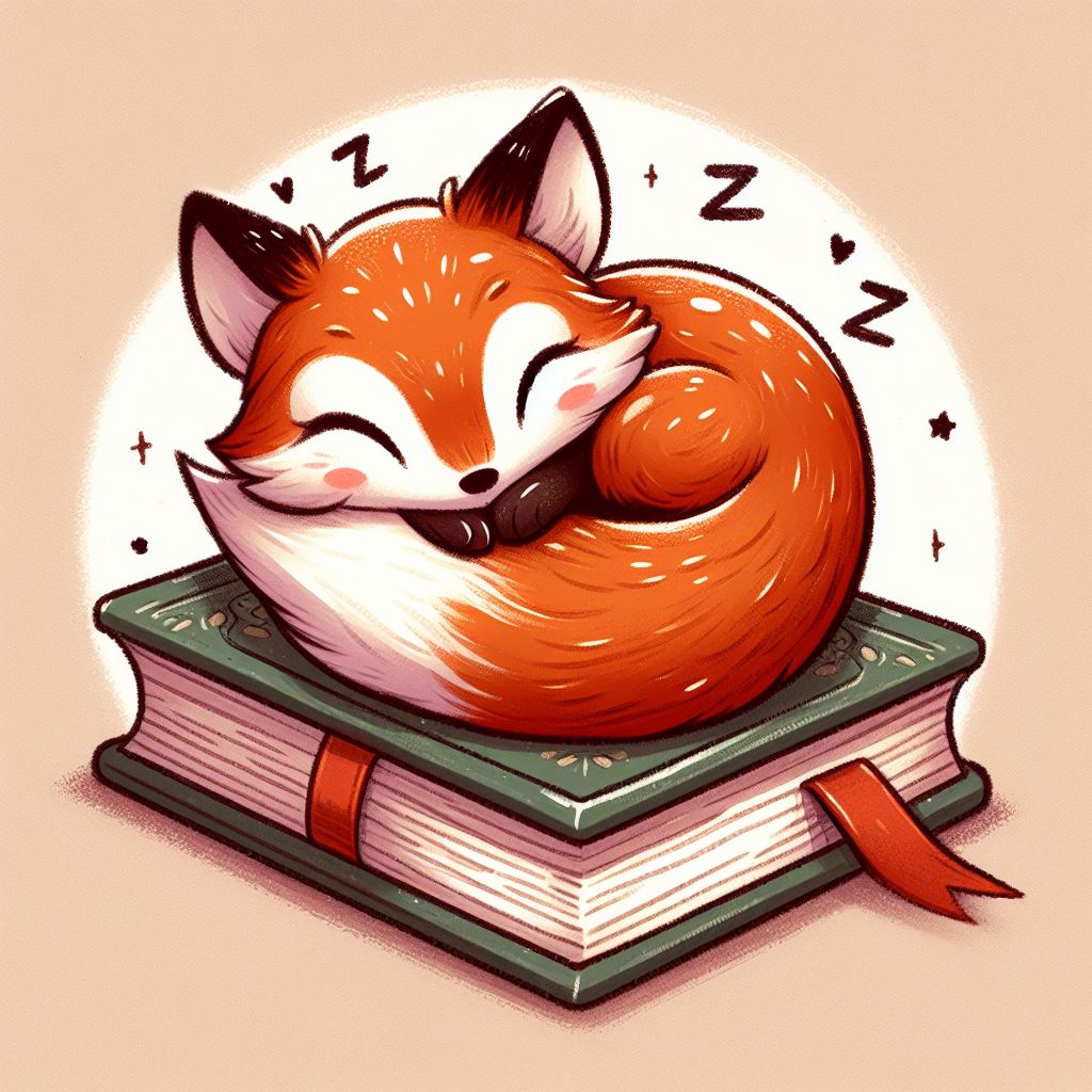 A cartoon fox curled up and sleeping on top of a large, closed book with a red ribbon bookmark.