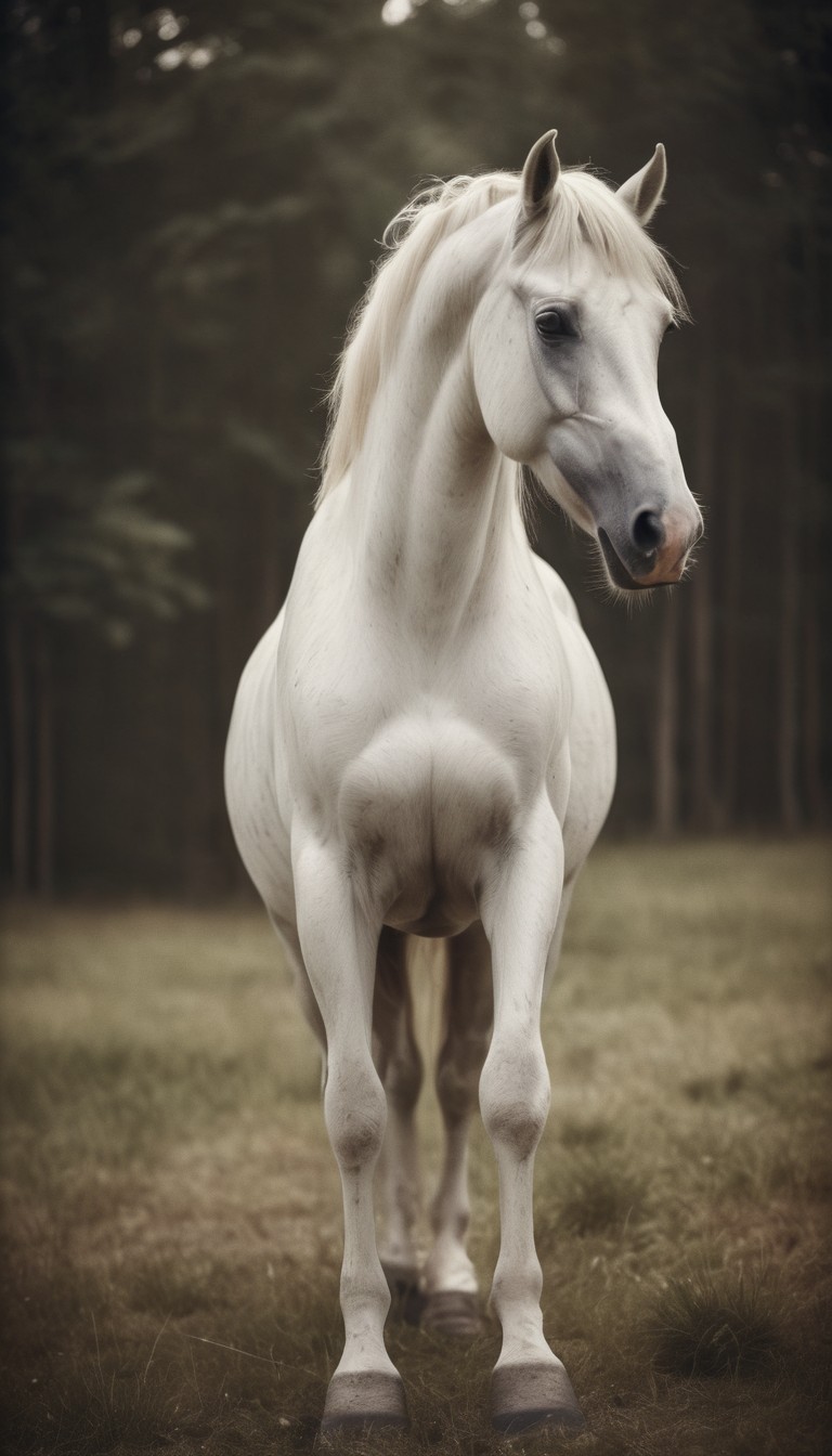 In a grassy clearing, a white horse stands framed by a dark forest. Its head is turned, gazing into the distance, giving the photo a timeless feel