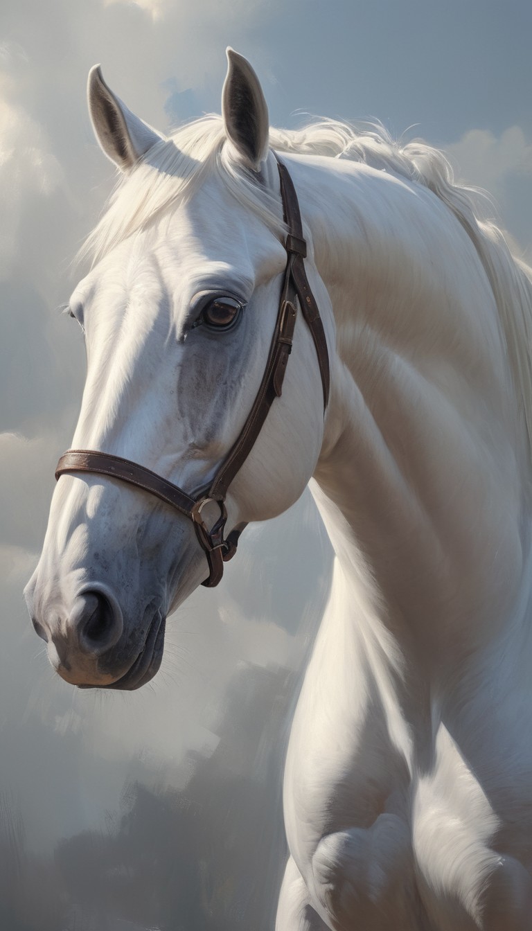 animal, beautiful, bridle, closeup, clouds, equestrian, equine, eye, face, head, horse, leather, mammal, mane, nature, neck, portrait, sky, white, wildlife