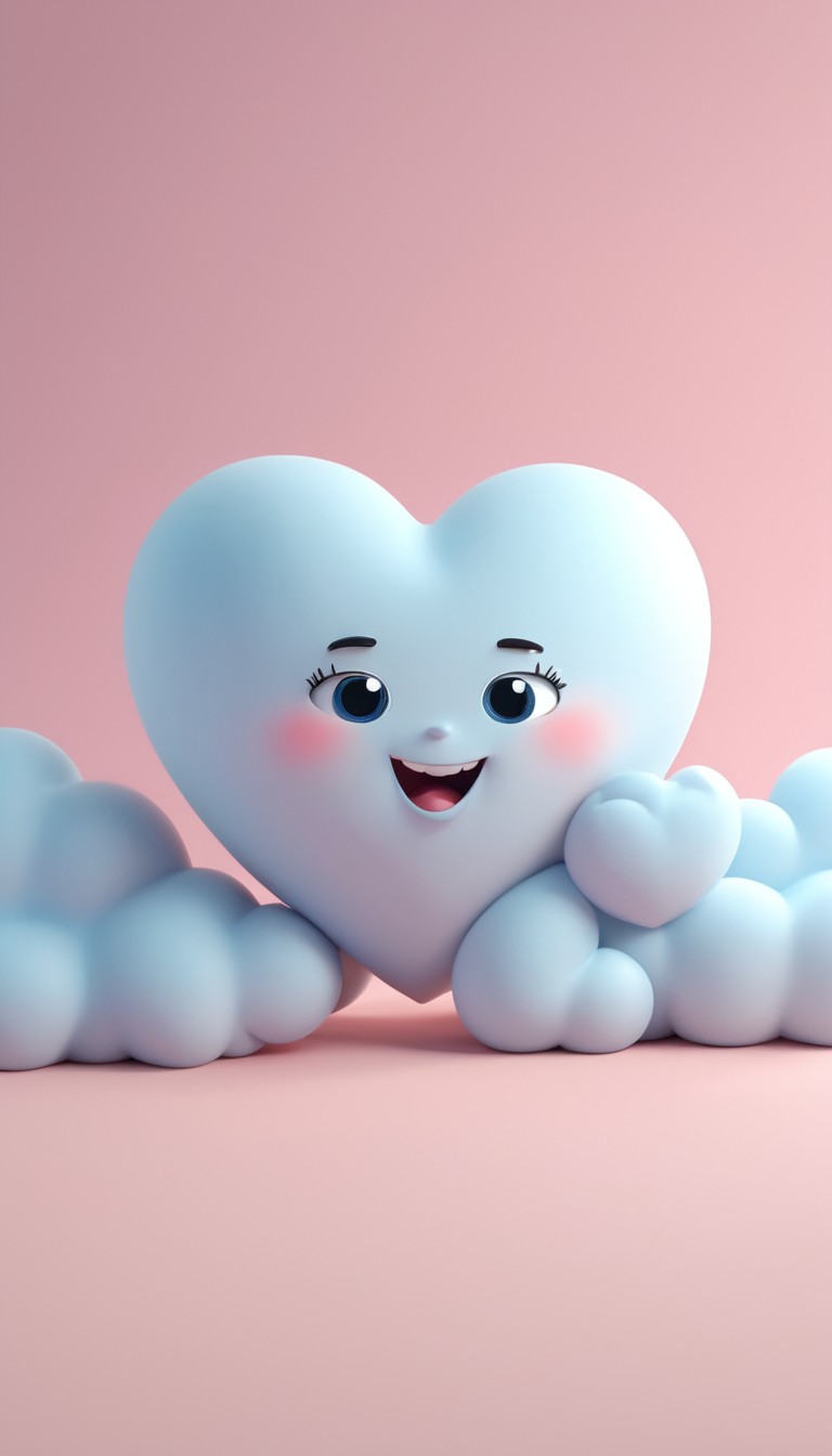 A blue heart with a happy face sits on blue clouds against a pink background.