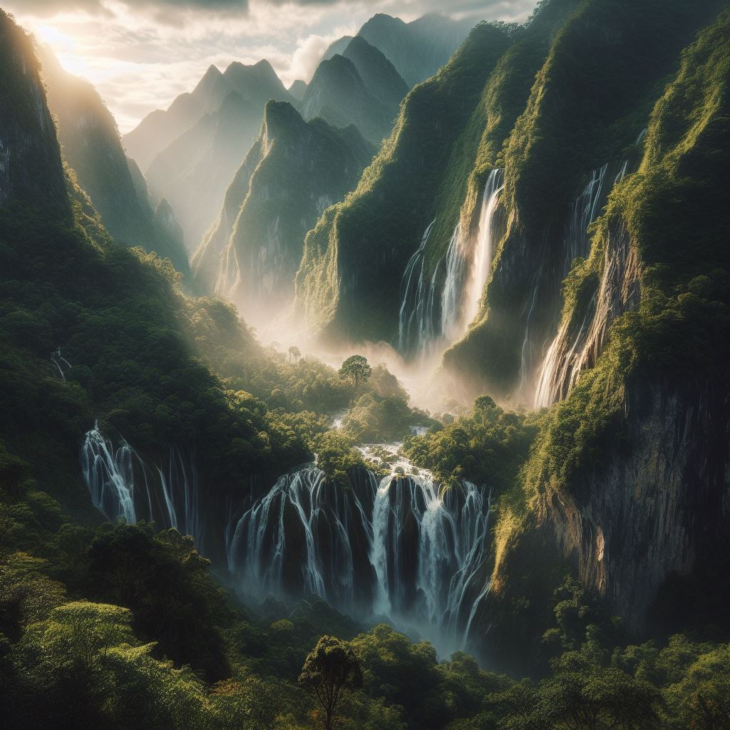 A valley filled with lush green vegetation and cascading waterfalls, bathed in the golden light of sunrise.