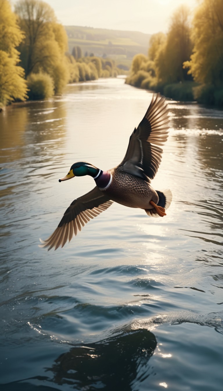 Duck flying over river