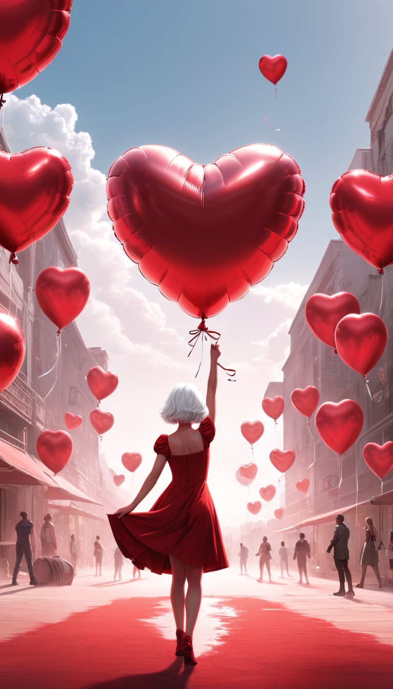 A woman in a red dress walks through a city street, holding a large heart balloon, surrounded by other heart balloons floating in the air.