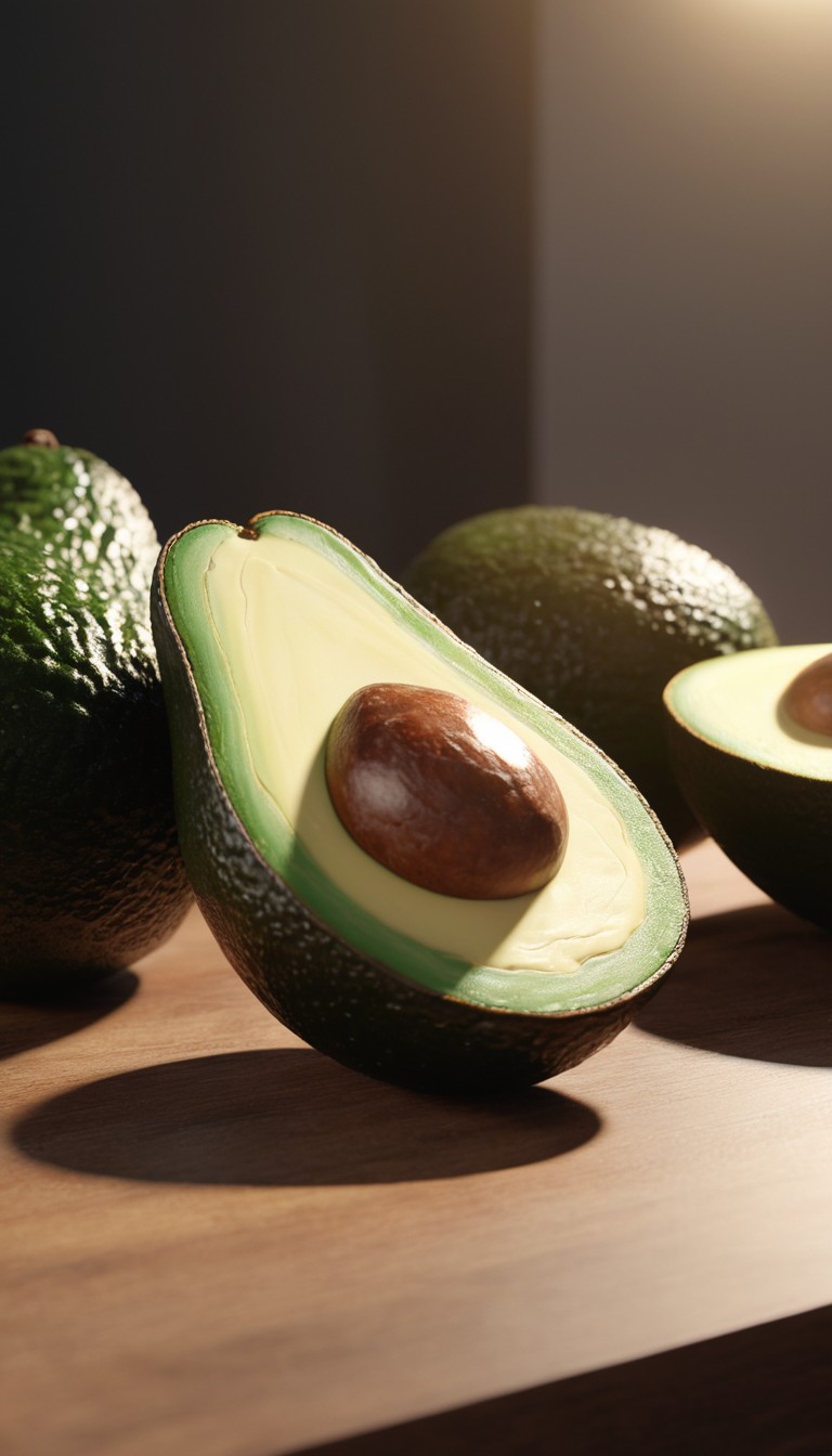A halved avocado rests on a wooden surface, its green flesh and brown seed visible.