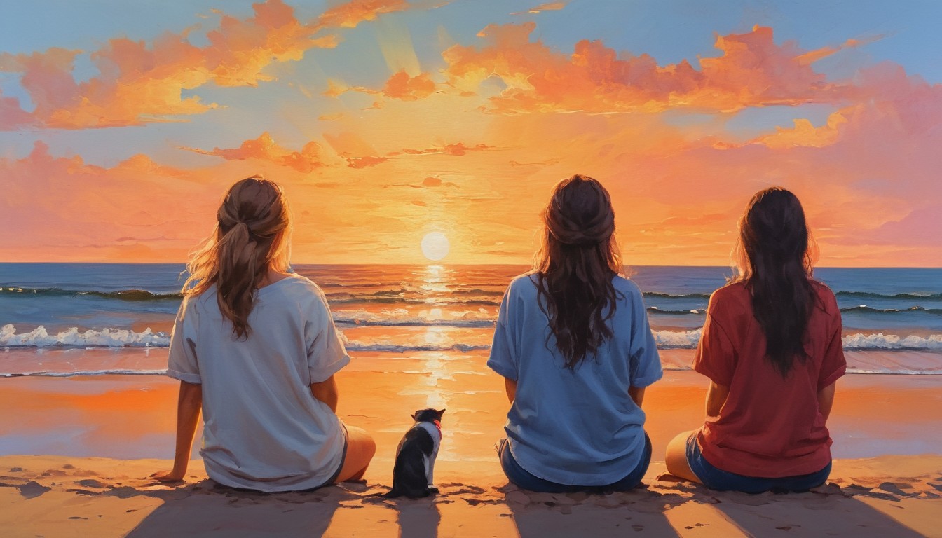 Three friends sit on a sandy beach, watching the sunset over the ocean. A small black and white cat sits between them.