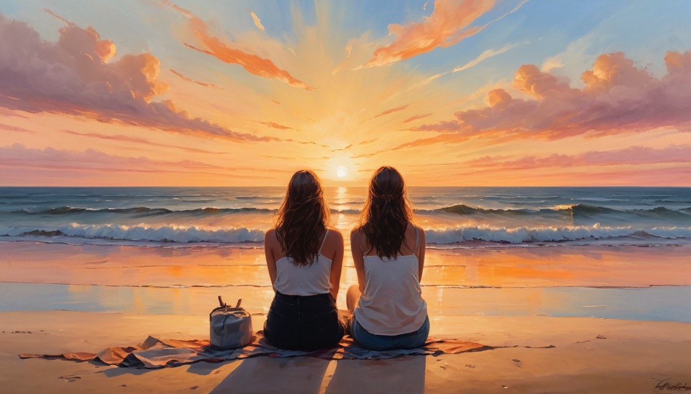 beach, calm, clouds, coastline, evening, friends, golden, horizon, hour, nature, ocean, peaceful, relaxing, sand, silhouette, sky, sunset, tranquil, water, women