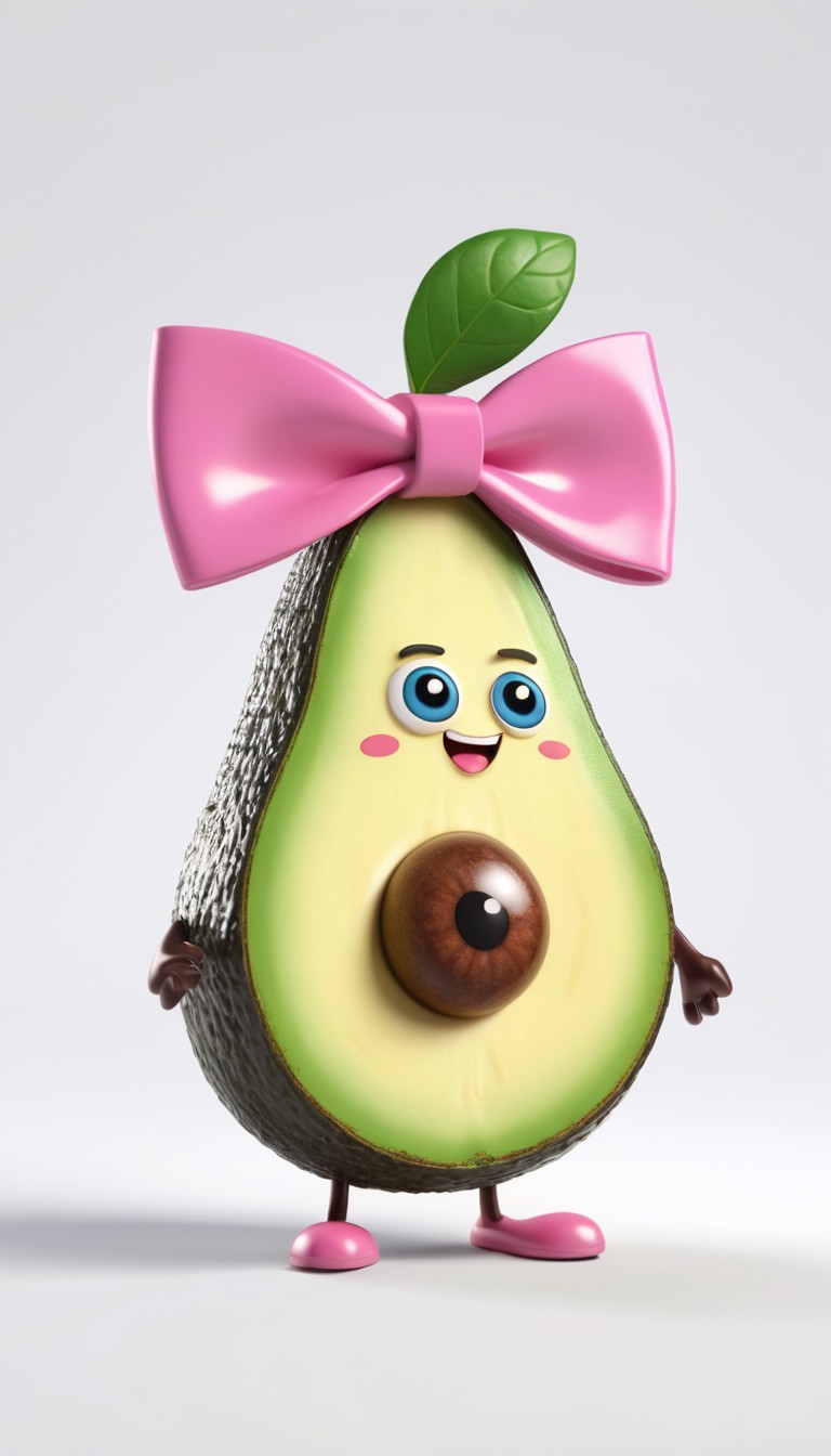 A cartoon avocado with a pink bow, blue eyes, and a smiling face stands on a white background.
