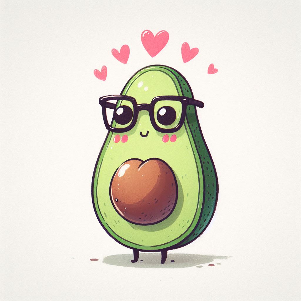 A cartoon avocado with glasses and a heart shaped pit is surrounded by pink hearts.