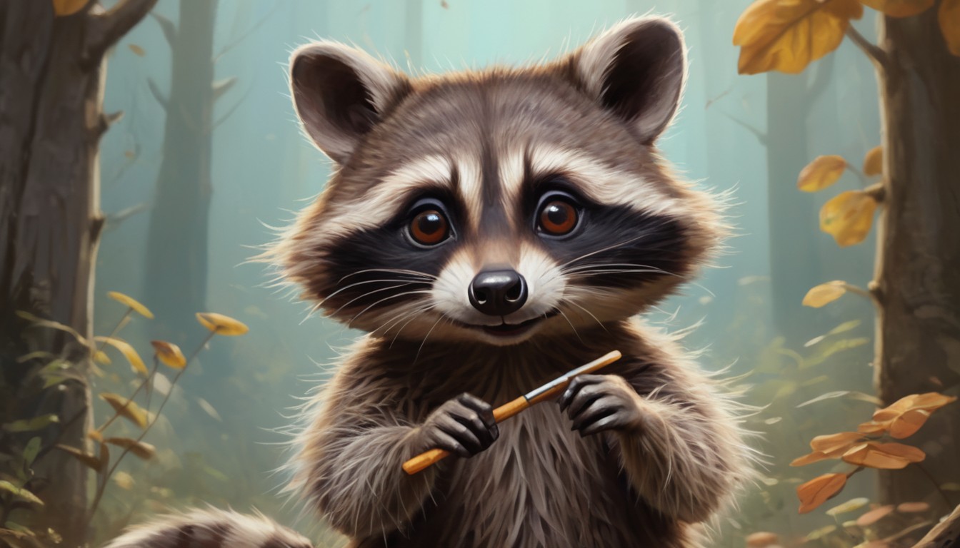 A raccoon with a playful expression holds a thin stick in a forest setting.