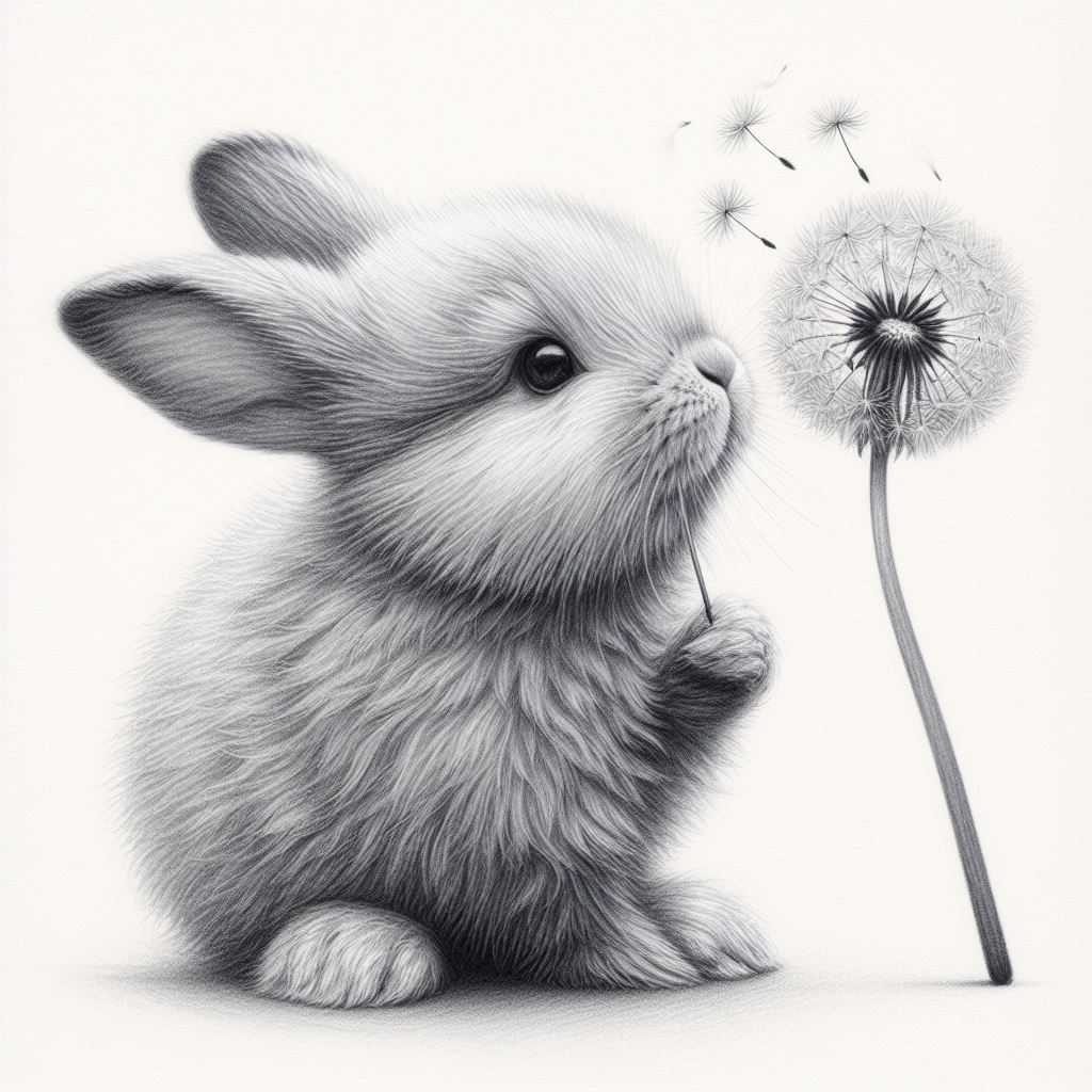 adorable, animal, art, black, bloom, bunny, cute, dandelion, drawing, flower, fluffy, furry, grey, illustration, nature, rabbit, seeds, soft, whimsical, white