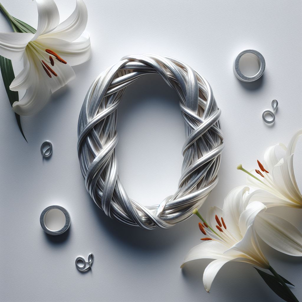 A silver wreath sits on a white background with two white lilies and small silver rings around it.