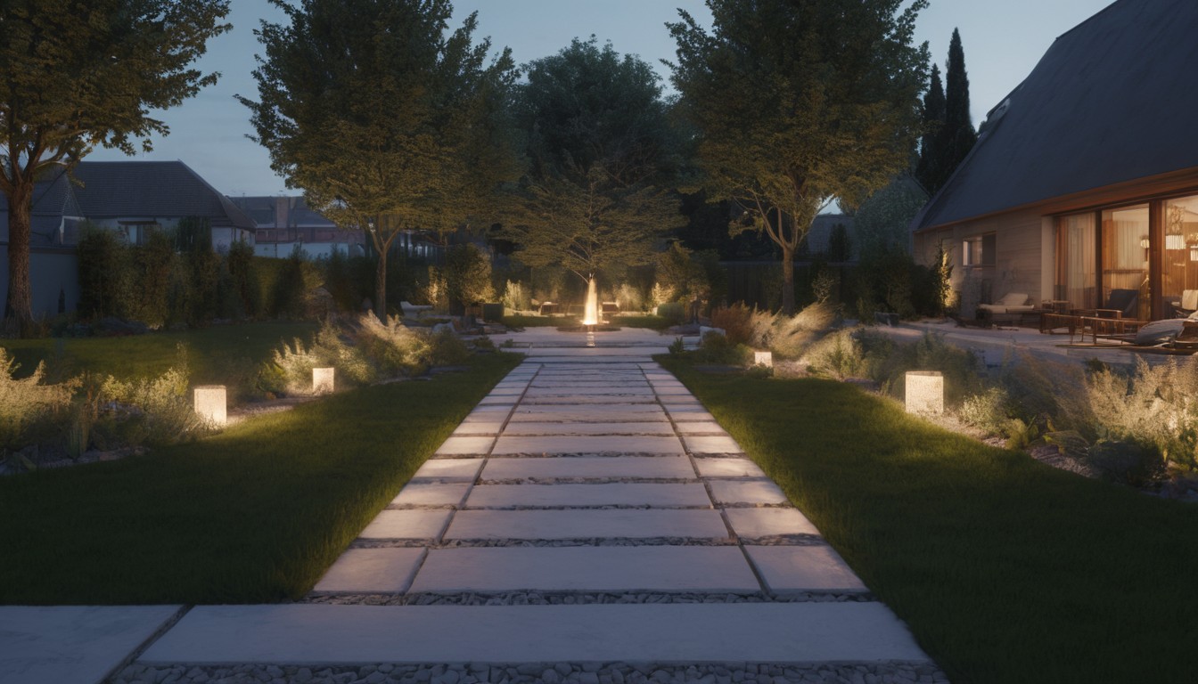 Illuminated pathway in evening garden