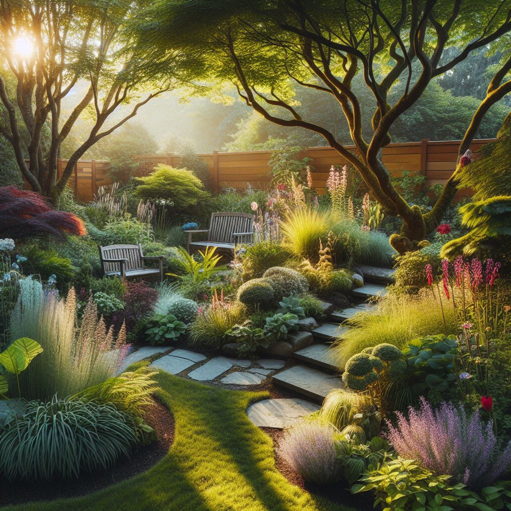 A stone path winds through a lush garden, with benches and vibrant foliage bathed in morning light.