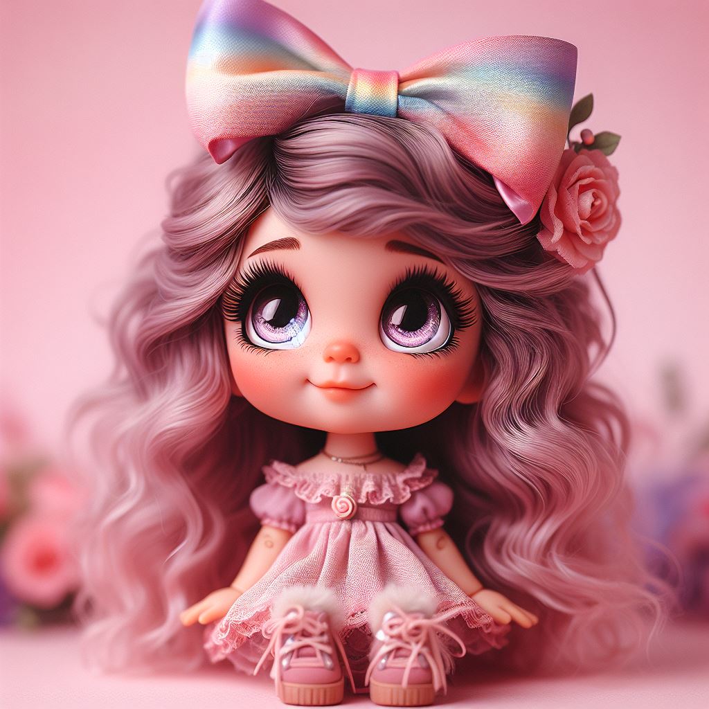 A pink doll with large eyes and a rainbow bow sits on a pink background.