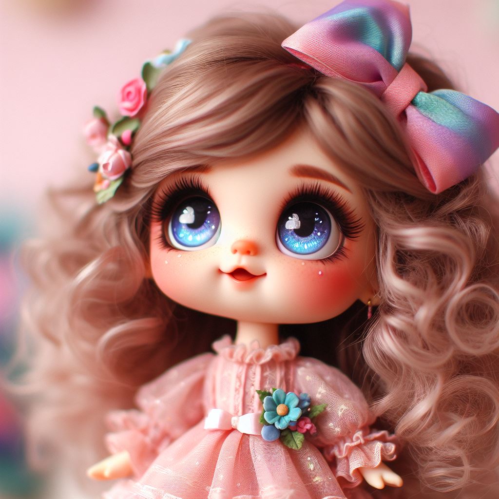 accessories, big, blue, bow, collection, curly, cute, doll, dress, eyes, face, flower, hair, head, large, outfit, pink, plastic, smile, toy