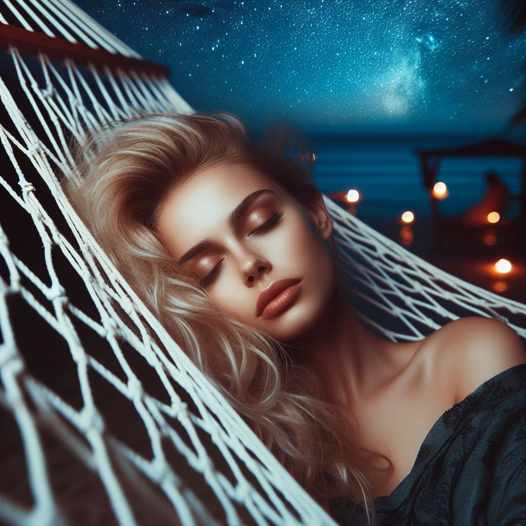 beauty, blonde, calm, comfort, dreaming, hair, hammock, night, peaceful, relaxed, rest, serene, sky, sleeping, stars, tranquility, travel, tropical, vacation, woman