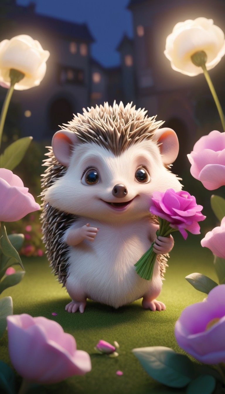 A cute, animated hedgehog holds a bouquet of pink roses in a garden at night.