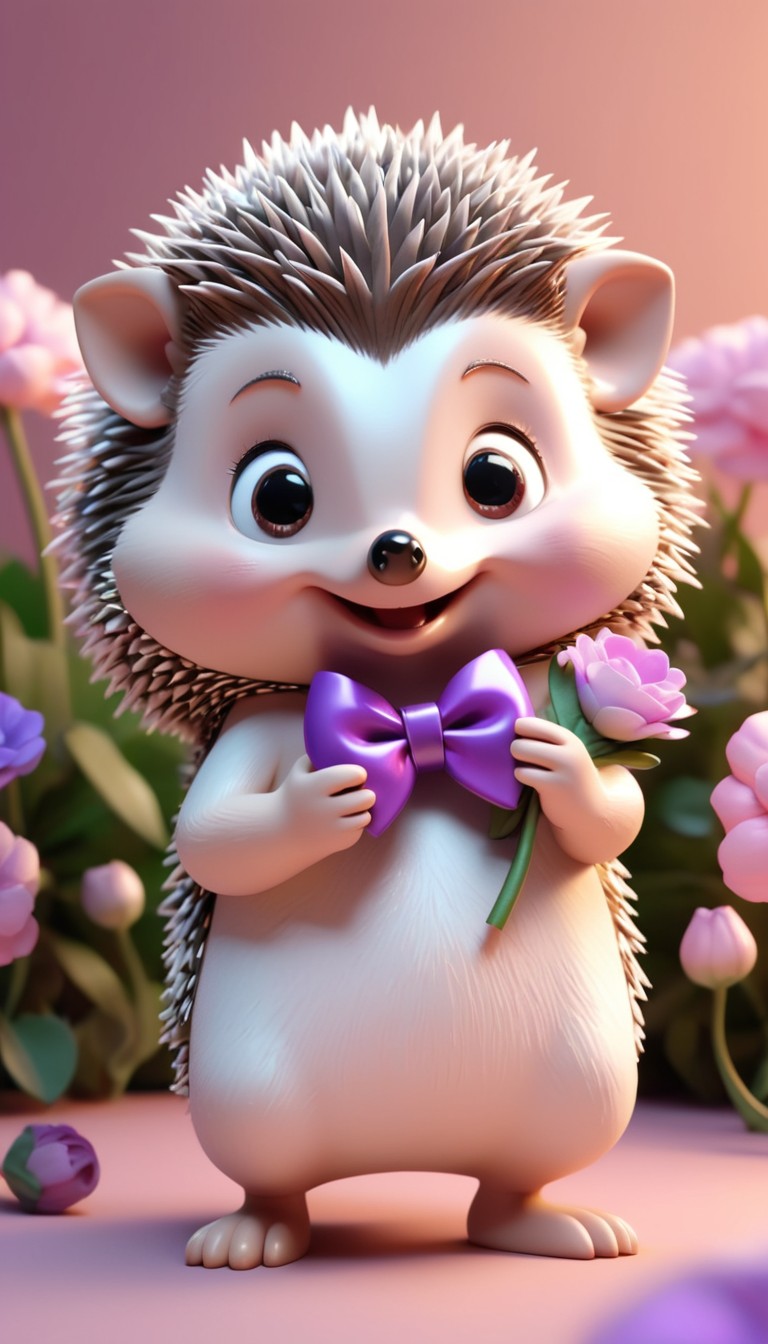 A cartoon hedgehog with a purple bowtie stands in a field of flowers and holds a pink rose.