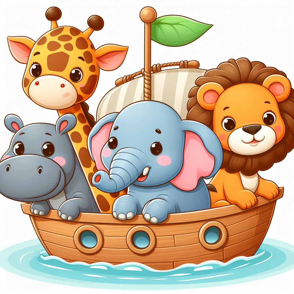 A cartoon hippopotamus, giraffe, elephant, and lion are sailing on a wooden boat in the water.