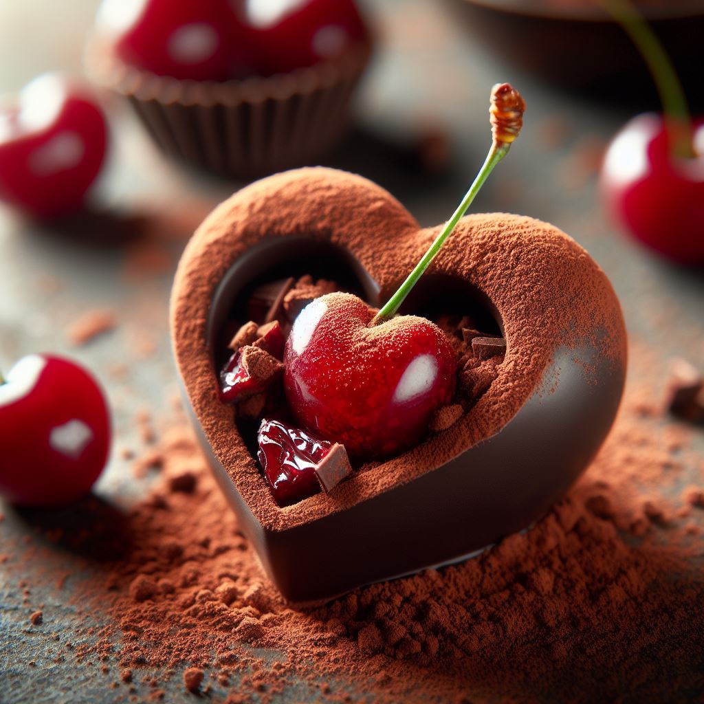 A heart-shaped chocolate mold filled with a bright red cherry and dusted with cocoa powder.