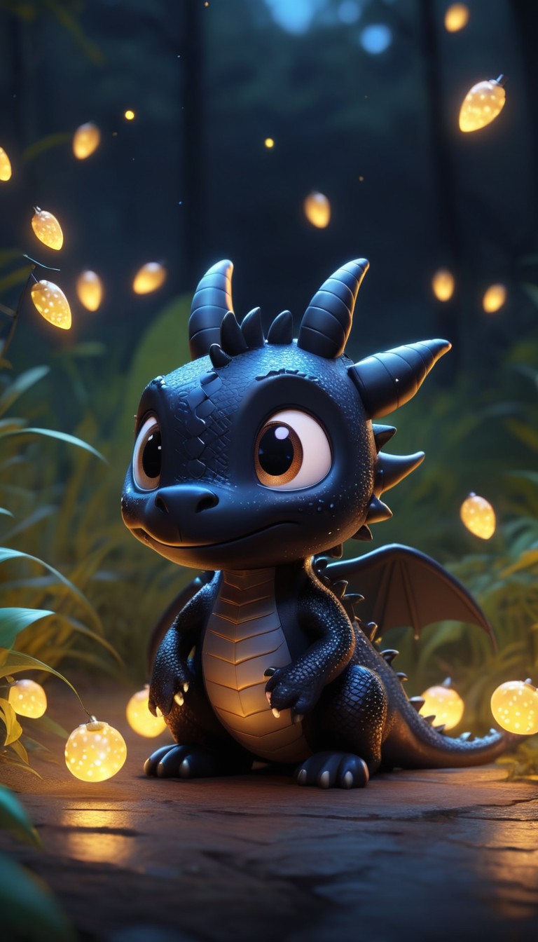 adorable, black, blue, creature, cute, dragon, eyes, fantasy, forest, glowing, green, leaves, lights, magic, mystical, night, path, scales, tail, wings