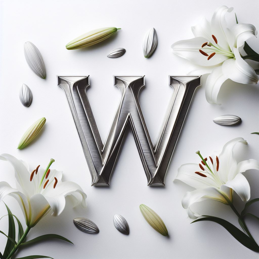 A silver letter W lies in the center of a white background surrounded by white lilies and their petals.
