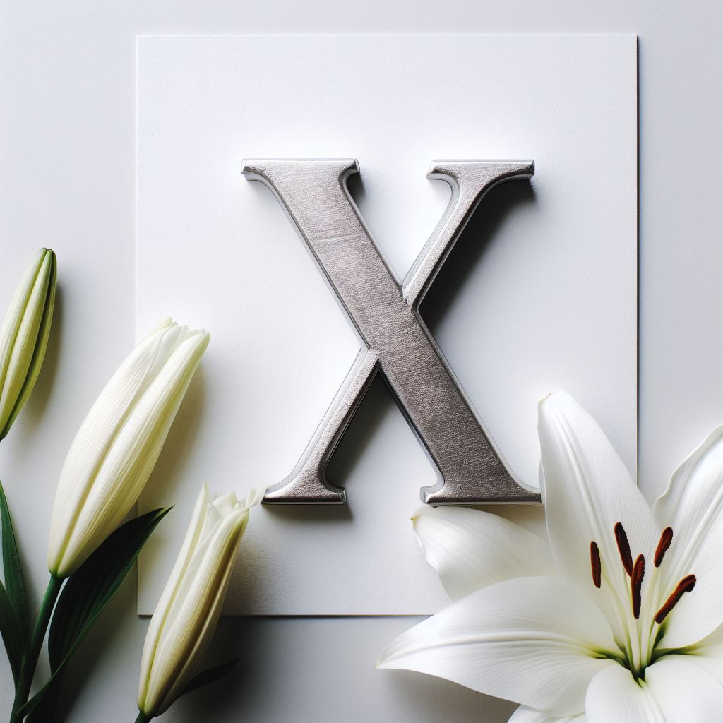 A silver letter X sits on a white background, surrounded by three white lilies.