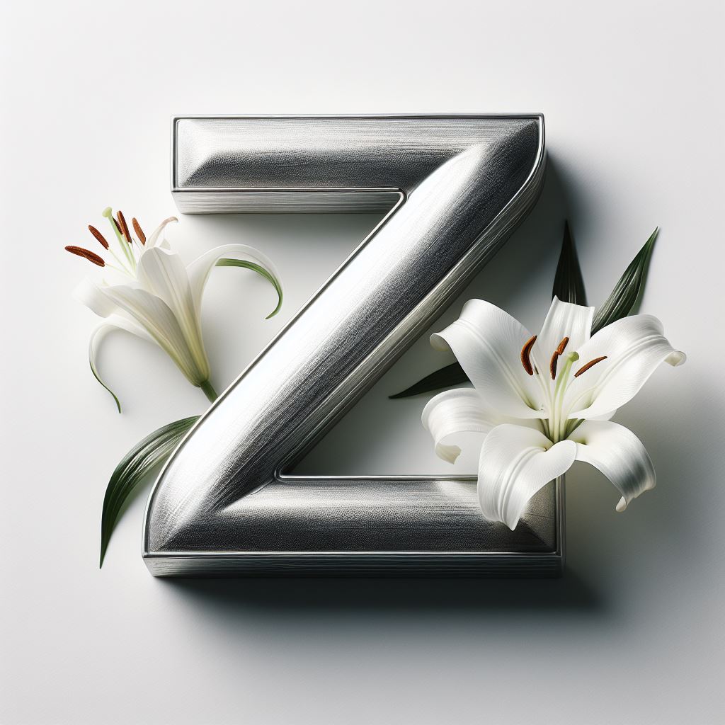 A metallic letter Z with a brushed finish is surrounded by white lilies. The background is white.